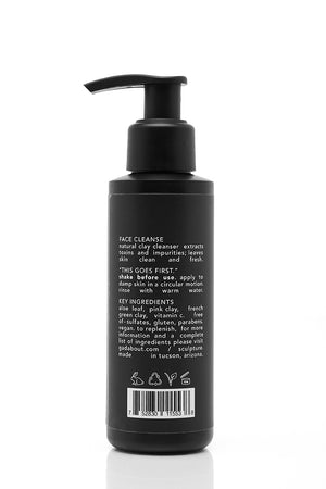 "This Goes First". Our pink clay face cleanser, enriched with aloe and activated vitamin C, detoxifies by extracting toxins and impurities. This natural formula leaves your face feeling clean, fresh, and never dry.